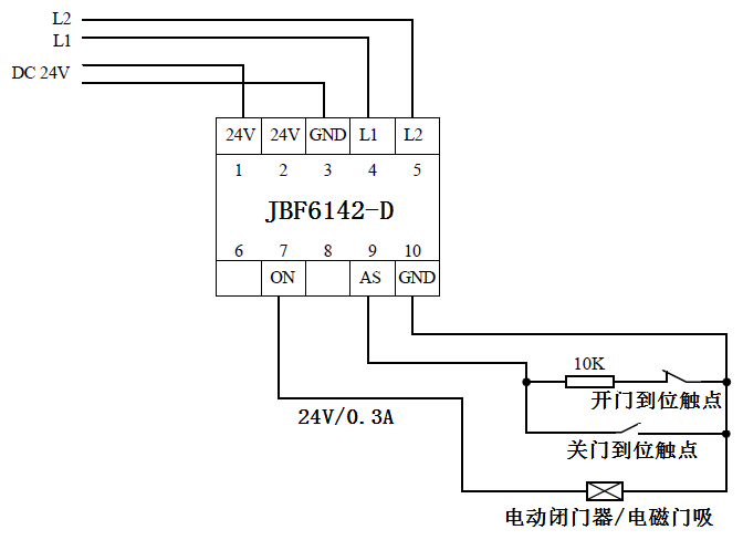 AS(端子9)、GND(端子10)連接電動(dòng)閉門器上的關(guān)門到位信號(hào)(無(wú)源觸點(diǎn));
