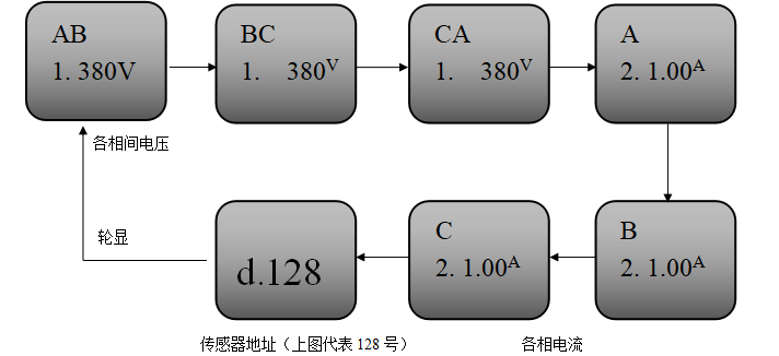 當傳感器線路連接正常、監(jiān)測電壓正常情況下,傳感器液晶屏將輪顯目前每一路的監(jiān)測電壓值、電流值及本傳感器在回路中所占地址,如下圖: